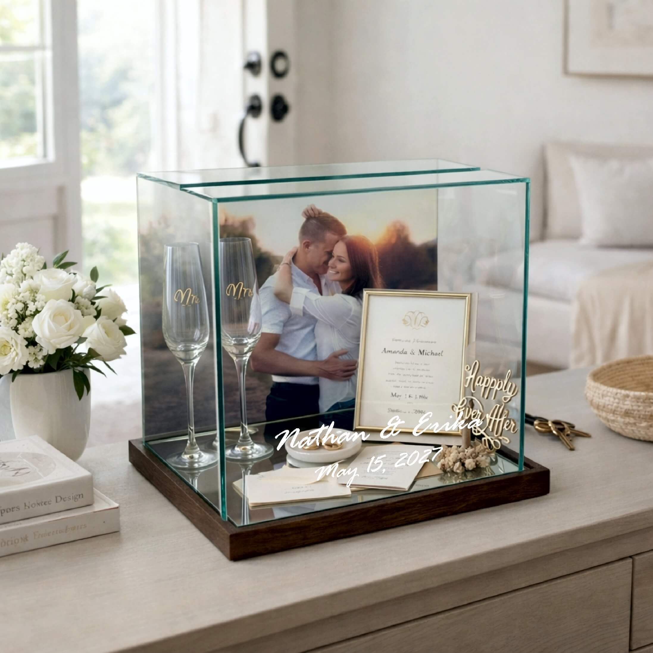 Your engagement or wedding photo is UV-printed directly onto the back panel of the glass box. It's not a print sitting inside — it's part of the glass itself. Guests see your faces every time they drop in a card.